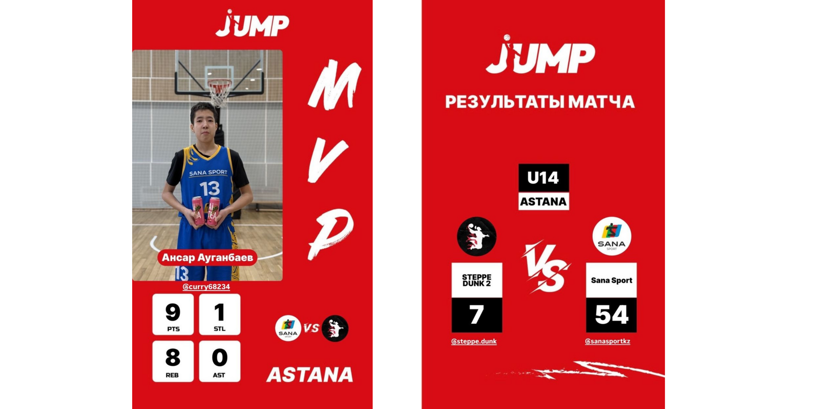 JUMP мектеп баскетбол лигасының көктемгі чемпионаты (U14 тұрақты чемпионаты) аясында Sana Sport командасы Steppe Dunk 2 командасын 54:7 есебімен айқын басымдықпен жеңді.